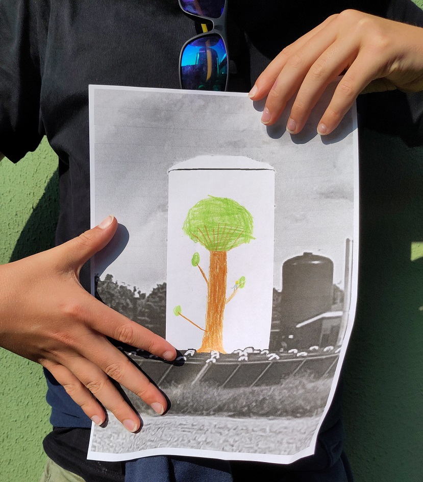 Kind hält Bild von Solarthermieanlage und mit einem Baum bemaltem Wärmespeicher